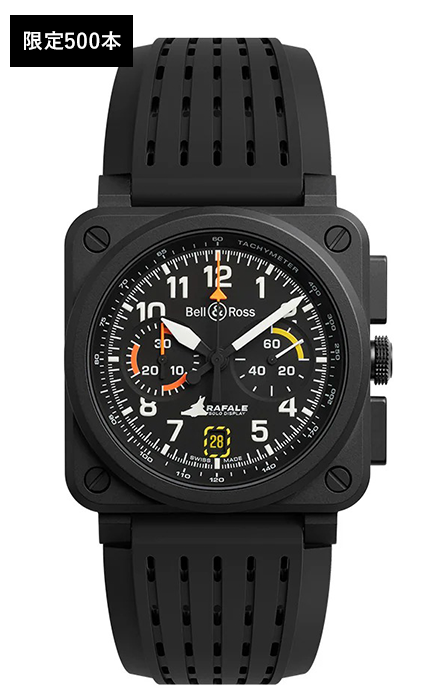 フランス空軍の精鋭パイロットによる「ラファール・ソロ・ディスプレイ」にインスパイアされた限定500本のモデル。高精度の自動巻ムーブメントBR-CAL.301を搭載し、ブラックセラミック製ケースが優れた耐久性を実現。戦闘機の計器を想起させるデザインと高い視認性を備え、航空エリートの精神とベル&ロスの技術力を象徴する特別なクロノグラフです。