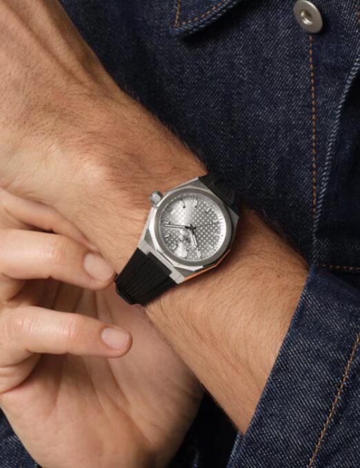 八角形の36mmスチールケースに、ファセットカットのベゼルを配した「デファイ スカイライン」。サンレイパターンを施したシルバートーン文字盤には、ゼニスの象徴である4つの点を結んだ星があしらわれています。エリート 670 自社製自動巻ムーブメントは、シースルーケースバックから眺めることができます。スチールブレスレットと、ブラックのラバーストラップが付属し、ストラップチェンジシステムにより簡単に付け替え可能です。