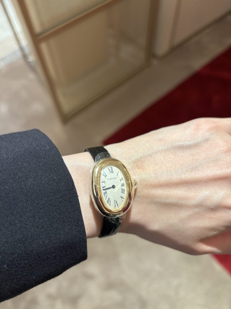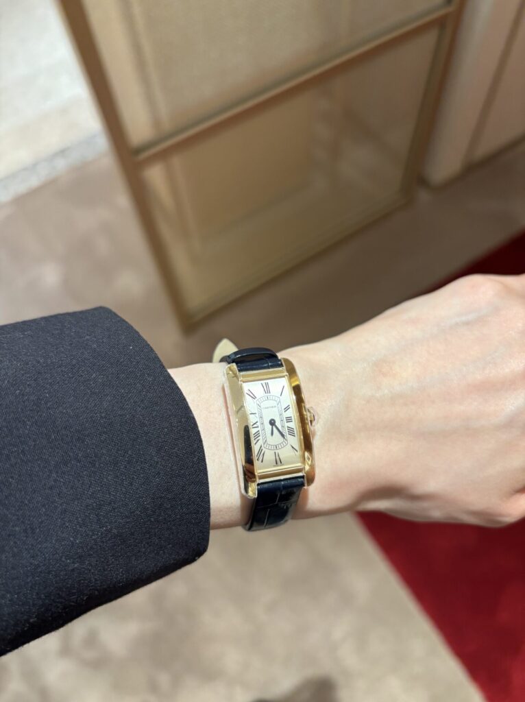 直線的で凛としたかっこよさもありつつ、レザーストラップがネイビーブルーで柔らかさもありました。