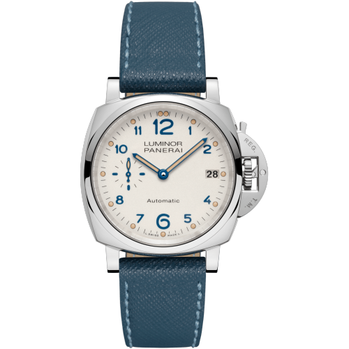 アイボリー文字盤にアラビア数字の青いインデックスが特徴です。