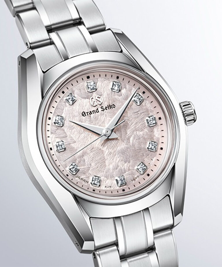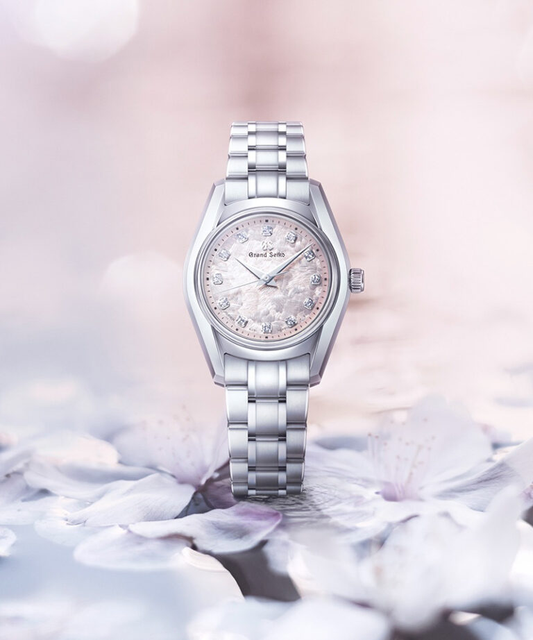 「62GS」の中でも高い支持を得ている「花筏(はないかだ)」に、26mmスモールサイズのクオーツモデルが加わりました。1967年発売のグランドセイコー史上初の自動巻機械式モデル「62GS」を現代的にアレンジした「62GS現代デザインモデル」をベースとし、日本特有の季節の移ろいをダイヤルで表現したモデルです。ベゼル(ガラス縁)のない構造によって広々と見えるダイヤルや、ザラツ研磨によって実現したシャープな多面体からなるケースが魅力です。ダイヤルは、風に舞い散った桜の花びらが川の水面を覆う「花筏」の情景を表現しています。ケースデザインは、小さいながらも高い視認性を確保。シンメトリーに配したダイヤモンドが生み出す、華やかで心地よいダイヤルに仕上げました。ムーブメントは、年差±10秒のクオーツ「キャリバー4J51」を採用しています。