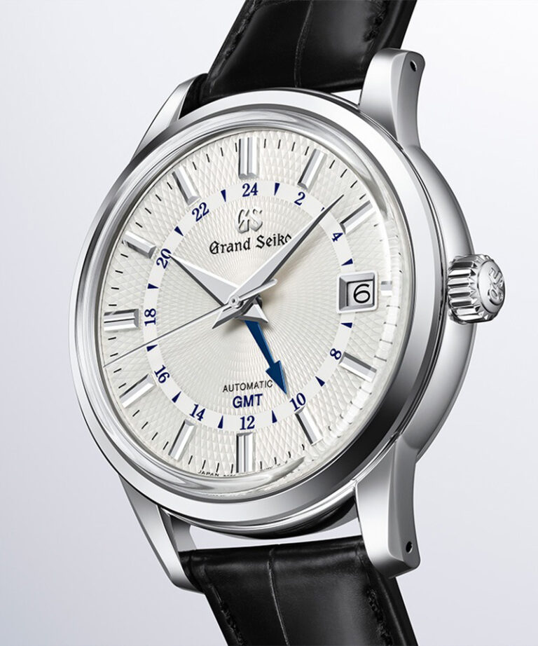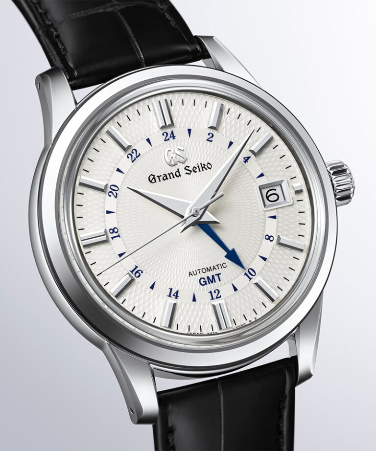 GMTの24時間表示部分の仕上げを変えることで立体感を生み、ホワイトのダイヤルに映えるテンパーブルーのGMT針が、爽やかなアクセントを添えます。