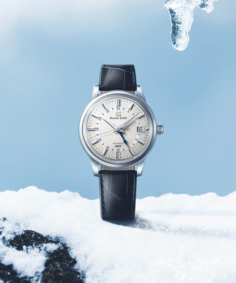 早春の季語「雪雫」から着想を得て、春の陽射しに輝く雪どけの雫をダイヤルに表現したクラシックスタイルのGMT機能付きモデルです。モダンな幾何学螺旋模様は、光の角度によって表情を変え、奥行きと動きを感じさせます。精緻なパターンが、ダイヤルに上質な立体感を与えます。搭載するムーブメントはメカニカル「キャリバー9S66」。最大巻上時約72時間(約3日間)の持続時間を確保しており、第二時刻を同時に指し示すGMT機能を備えています。ブルースチールの24時針が織りなす上品なクラシックスタイルに、モダンなダイヤルデザインが調和し、グランドセイコーならではの優雅さを演出します。