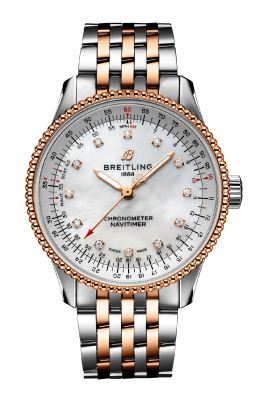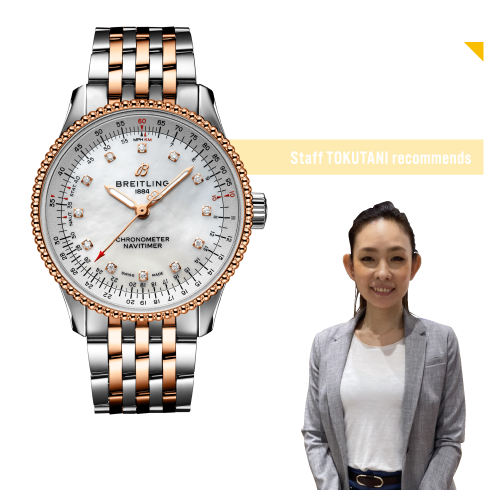 ナビタイマーをレディースモデルにアレンジしたナビタイマーの35㎜タイプ。ダイヤルにはマザーオブパールとダイヤを採用し18Kゴールド製のベゼルのビーズ装飾とのコンビネーションで可愛らしさが引き立ちます。アリゲーターレザーストラップとの組み合わせが選べるのも楽しくておススメです!
