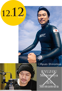 篠宮龍三(しのみやりゅうぞう)/プロフリーダイバー。1976年11月11日、埼玉県生まれ。世界で7人目、アジア人で初となる水深100mに辿り着いた男(2008年4月バハマにて記録)。日本国内で唯一のプロ選手。沖縄に在住し、国際大会を中心とした競技活動のかたわら、スクールやフリーダイブの大会を運営。現在は、海の保護やマリンスポーツの活性化を目的とした「ONE OCEAN」プロジェクトを立ち上げ、世界に向けて発信中。