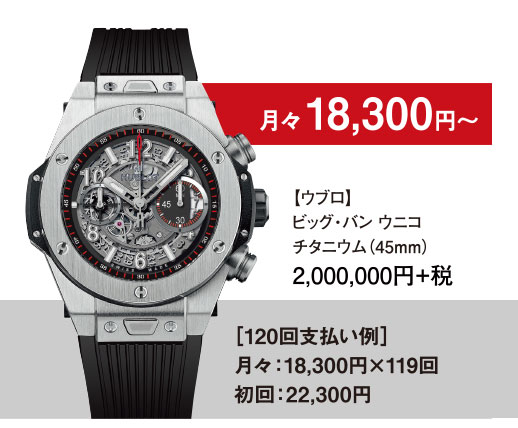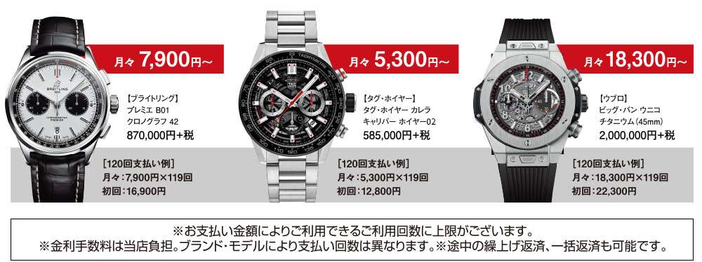 ※金利手数料は当店負担。ブランド・モデルにより支払い回数は異なります。※途中の繰上げ返済、一括返済も可能です。