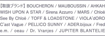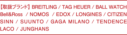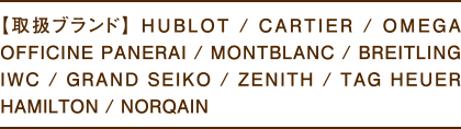 HUBLOT / CARTIER / OMEGA / OFFICINE PANERAI / MONTBLANC / BREITLING / IWC / GRAND SEIKO / ZENITH / TAG HEUER / HAMILTON NORQAIN / BALL WATCH / Bell&Ross / NOMOS / EDOX / LONGINES / CITIZEN / SINN / SUUNTO / GAGA MILANO / TENDENCE / LACO / JUNGHANS BOUCHERON / MAUBOUSSIN / AHKAH/WISH UPON A STAR / Sirena Azzurro / MARS / Chloé / See By Chloé / TOFF & LOADSTONE VIOLA'dORO / FRED / ADER.bijoux / e.m. / oeau / Dr. Vranjes / JUPITER BLANTELIE / MARIHA / HIROTAKA etc.